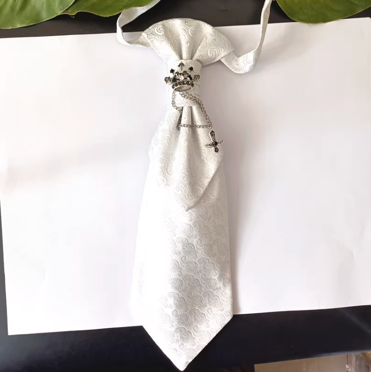 繊細な模様が施された生地と洗練されたデザインで、花婿や参列者にふさわしい格調高いネクタイです。